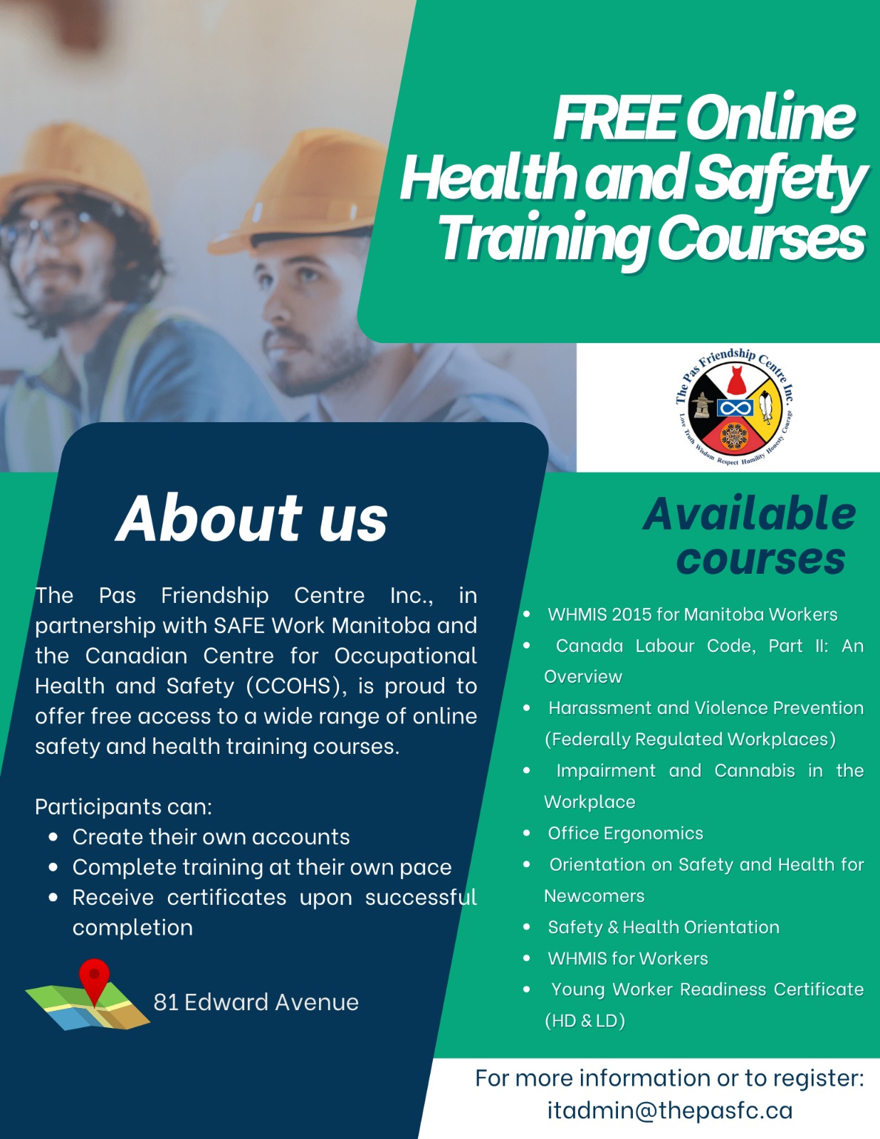 In partnership with SAFE Work Manitoba and the Canadian Centre for Occupational Health and Safety (CCOHS), The Pas Friendship Centre Inc. offers free access to online safety and health training courses.